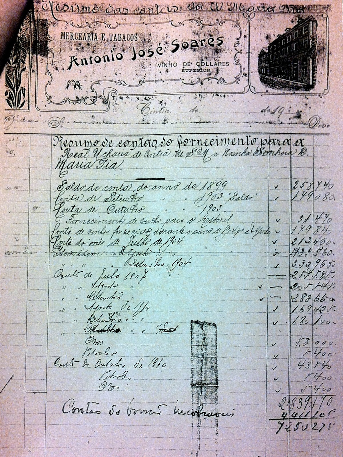 A escolha recaíu no habitual fornecedor sintrense da Real Ucharia de Cintra, a Mercearia e Tabacos de António José Soares, conforme prova factura que hoje publicamos de 4 de Outubro de 1910.